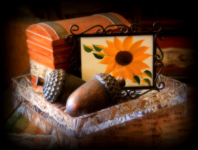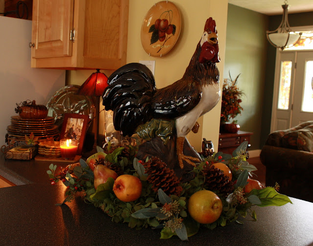 Karen, your home looks like it almost glows with the warm fall colors. The rooster vignette is very pretty. I like decorating with roosters, too. Somehow they seem to make a space look comfortable and inviting. The framed sunflower is very special and looks perfect in the vignette. Have a great weekend!---Shannon